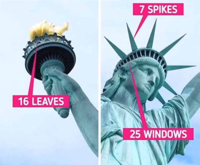 Tượng Nữ thần tự do có 7 chiếc gai trên vương miện, tượng trưng cho 7 vùng biển và 7 lục địa trên thế giới. Bên cạnh đó, số 7 còn ẩn chứa trong các chi tiết khác. Cụ thể, trên ngọn đuốc có 16 họa tiết lá, nếu cộng số 1 và số 6 thì sẽ được số 7. Ngoài ra, còn có 25 khoảng trống trên vương miện, tổng 2 chữ số thành phần cũng bằng 7.
