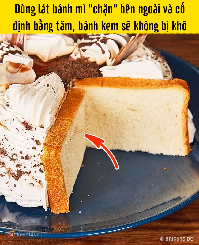 Khi ăn bánh kem, bánh sinh nhật không hết, chúng ta thường để trong tủ lạnh để bảo quản. Điều đó khiến cho bề mặt bánh bị cắt ra rất nhanh khô. Các bạn hãy lấy một lát bánh mì gối "chặn" lại rồi dùng tăm cố định, phần bánh kem sẽ không bị khô nữa.