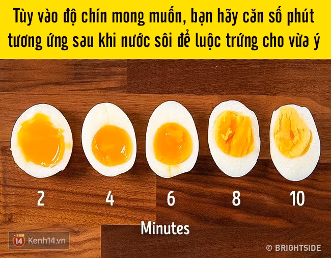 Với mẹo trứng luộc có độ chín như ý, bạn có thể căn thời gian luộc tương ứng như hình dưới.