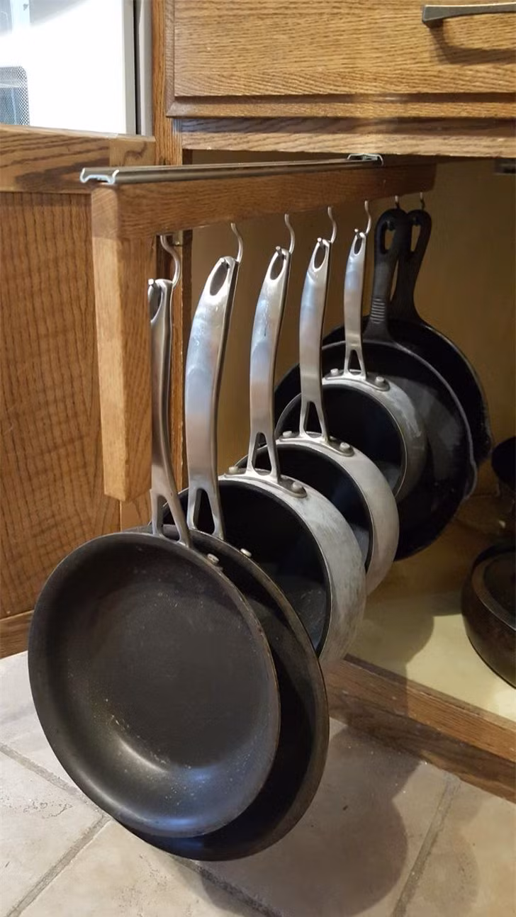13. Để tất cả chảo của bạn không bị trầy xước và dễ lấy hơn chỉ với một thanh trượt như thế này trong tủ.