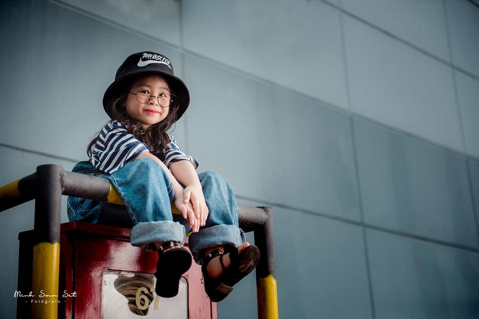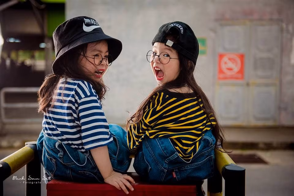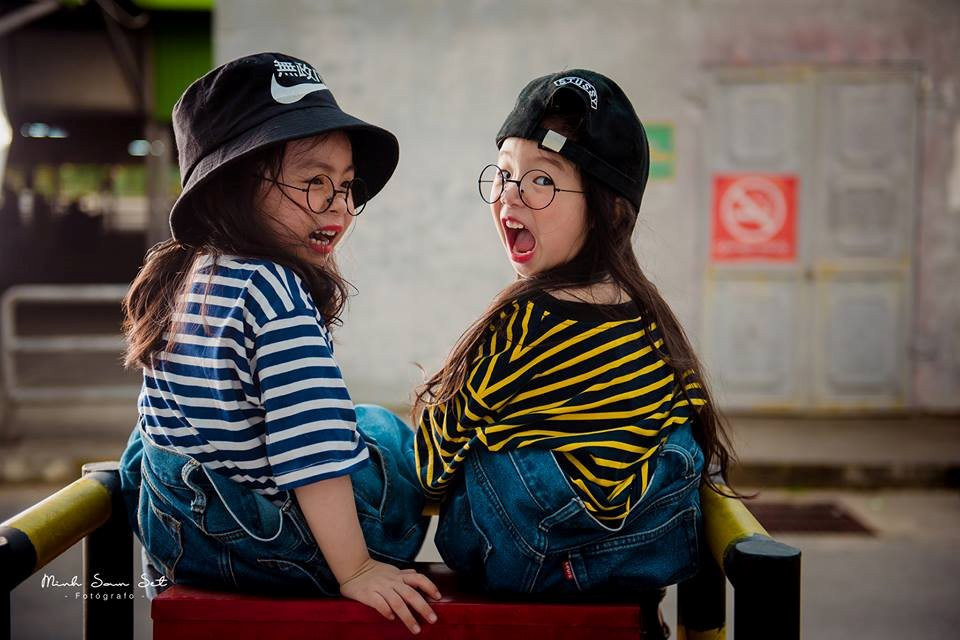 Quần jean ông ngoại, cặp kính mắt tròn nobita, mũ lưỡi trai đội lệch, trông 2 bé thật "fashion" không thua kém gì người mẫu.