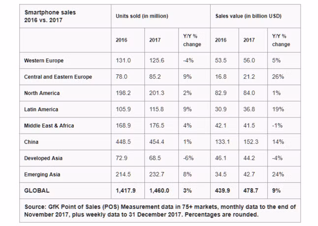 Để khẳng định lời nói trên, hãng nghiên cứu GfK đã thống kê và cho thấy: 2017 là năm giá bán smartphone trung bình đạt mức kỷ lục. Trong khi lượng smartphone bán ra trên toàn cầu chỉ tăng 1%, giá bán trung bình của chúng lại tăng đến 10% so với năm 2016, đạt 363 USD (8,25 triệu đồng). Không ảnh hưởng nhiều đến Bắc Mỹ nhưng sự gia tăng này lại khiến khu vực Trung Quốc và Đông Âu chịu ảnh hưởng nặng nề.