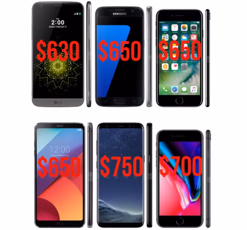 Giá bán smartphone cao cấp từ 3 nhà sản xuất lớn tại Mỹ: Apple, Samsung và LG đã tăng đều đặn từ khi chiếc iPhone đầu tiên ra mắt. Như trong biểu đồ trên đây, giá bán iPhone đời đầu chỉ là 500 USD, nhưng đến iPhone 8 đã tăng lên 700 USD. Thế hệ Galaxy S đầu tiên ra mắt năm 2010 cũng chỉ có 500 USD, nhưng đến Galaxy S8 ra mắt năm ngoái thì đã lên 750 USD.