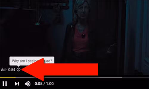 Khi đang xem video trên YouTube, nếu thấy quảng cáo xuất hiện trên màn hình, bạn hãy bấm vào biểu tượng chữ "i" (Why am I seeing this ad?) ở góc trái bên dưới.
