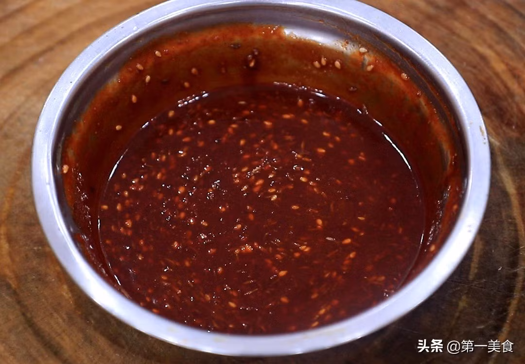 Bước 3: Chế biến nước sốt chấm: cho một thìa sốt cay, sốt tương đen, sốt thịt nướng, sốt nấm Đài Loan, nước tương tỏi ớt vào bát khuấy đều, sau đó đổ một chút rượu nấu ăn vào. Cuối cùng, thêm một lượng vừa đủ hạt mè trắng và hạt thì là.