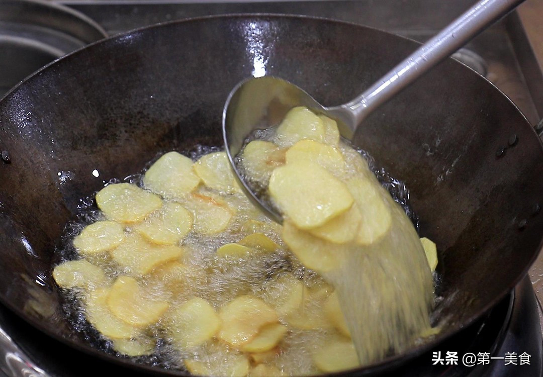 Bước 5: Chiên khoai tây: Đun nóng dầu trong nồi, vặn lửa nhỏ khi nhiệt độ dầu nóng 50% thì cho khoai vào nồi, thường xuyên dùng thìa để lật khoai cho đều, giữ lửa nhỏ và chiên cho chín vàng. Chiên khoảng 2 phút thì vớt ra để riêng cho ráo dầu.