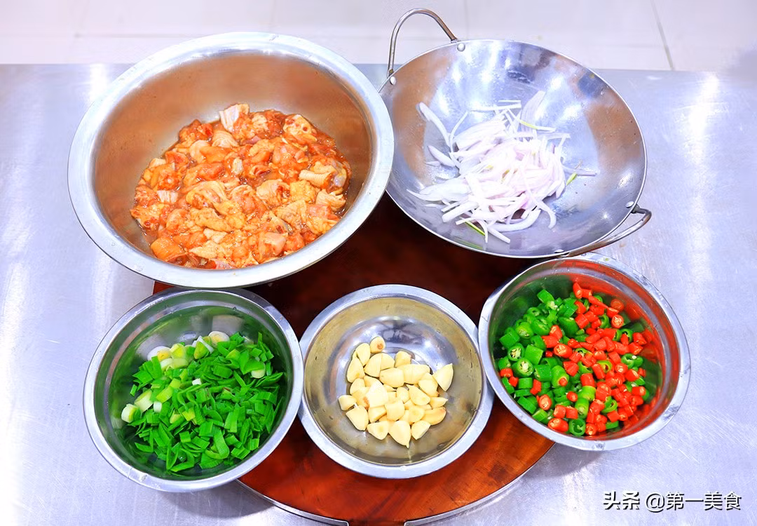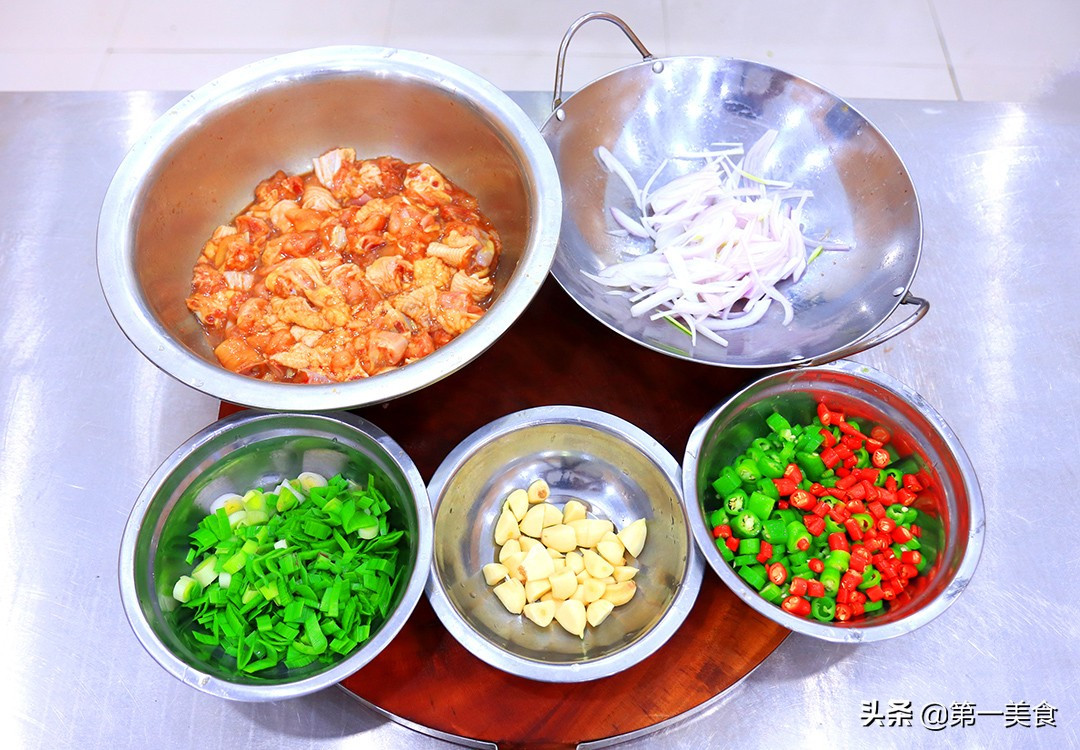 Bước 1: Chuẩn bị nửa con gà, rửa sạch tiết và chặt thành từng miếng nhỏ. Cho vào chậu ướp cùng 2 gam muối, 2 gam tiêu, 10 gam hành, 2 gam nước tương và một chút rượu nấu ăn trong vòng 10 phút.
