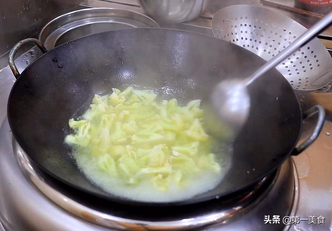 Bước 4: Chần qua nước: đun sôi nước trong nồi, thêm chút muối rồi đổ súp lơ vào sau khi nước sôi, thêm ít dầu thực vật vào để giữ dinh dưỡng trong súp lơ, chần sơ qua khoảng 1 phút. Sau đó, lấy súp lơ để ra ngoài cho ráo nước.