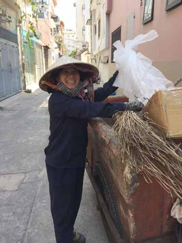 Hàng ngày, chị rời nhà lúc 8h, bắt đầu đi gom cho đến khoảng 13g thì đã giao xong rác. Ăn trưa và nghỉ ngơi một lát, chị tiếp tục đi lau dọn nhà cho các gia đình. Nhờ thế mà chị cải thiện được cuộc sống.