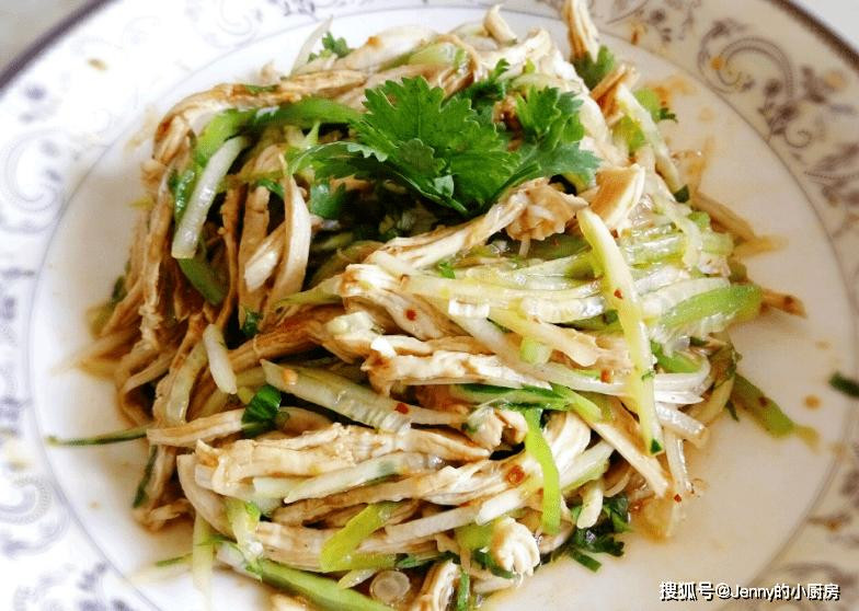 Bước 3: Trộn đều thịt gà xé, dưa chuột cắt sợi, rau mùi và ớt xanh, sau đó cho muối, nước tương nhạt, dầu hào, bột gừng, nước cốt gà, dầu ớt vào đảo đều. Nếu muốn lượng calo thấp hơn thì có thể gia giảm gia vị.