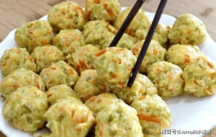 Cần tây rửa sạch, cắt khúc, cà rốt rửa sạch và cắt miếng, cho vào nước sôi nấu trong 2 phút. Sau khi để nguội cắt thành từng miếng nhỏ hoặc xay vụn, đổ vào bát lớn, thêm thịt xay, bột ngô, bột mì vào trộn đều. Vo thành những viên nhỏ rồi cho vào xửng hấp trong 10 phút ở lửa lớn.
