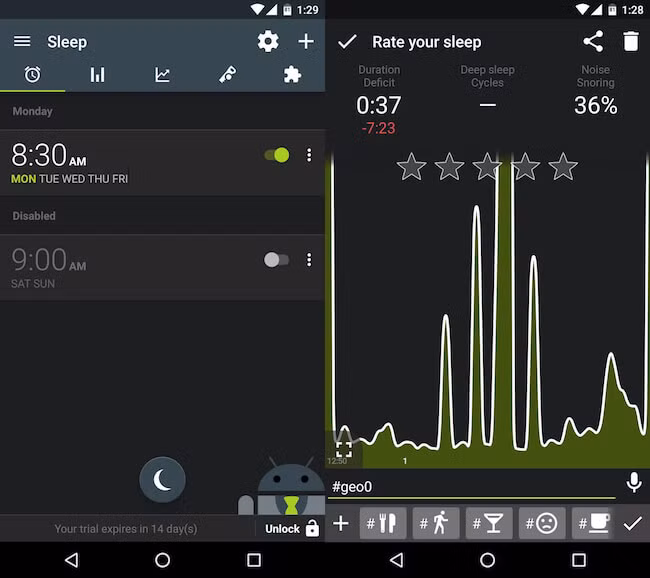 Đầu tiên, bạn hãy chọn khoảng thời gian cần thức dậy, sau đó cắm sạc điện thoại và để thiết bị ở ngay bên cạnh giường. Kể từ lúc này, Sleep as Android sẽ theo dõi giấc ngủ bằng cách phát hiện tiếng ngáy hoặc khi bạn lăn lộn, thay đổi tư thế nằm… Dựa vào những dữ liệu này, ứng dụng sẽ xác định chu kì giấc ngủ và khi gần đến giờ báo thức, nó sẽ tự động lựa chọn khoảng thời gian tốt nhất và đánh thức bạn dậy bằng một giai điệu nhẹ nhàng và tăng dần về âm lượng.