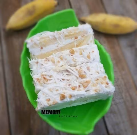 Xếp 1 lớp chuối cho kín đáy hộp rồi đổ hỗn hợp sữa nước cốt dừa lên. Rắc dừa najp và đậu phộng rang giã hơi giập lên trên.