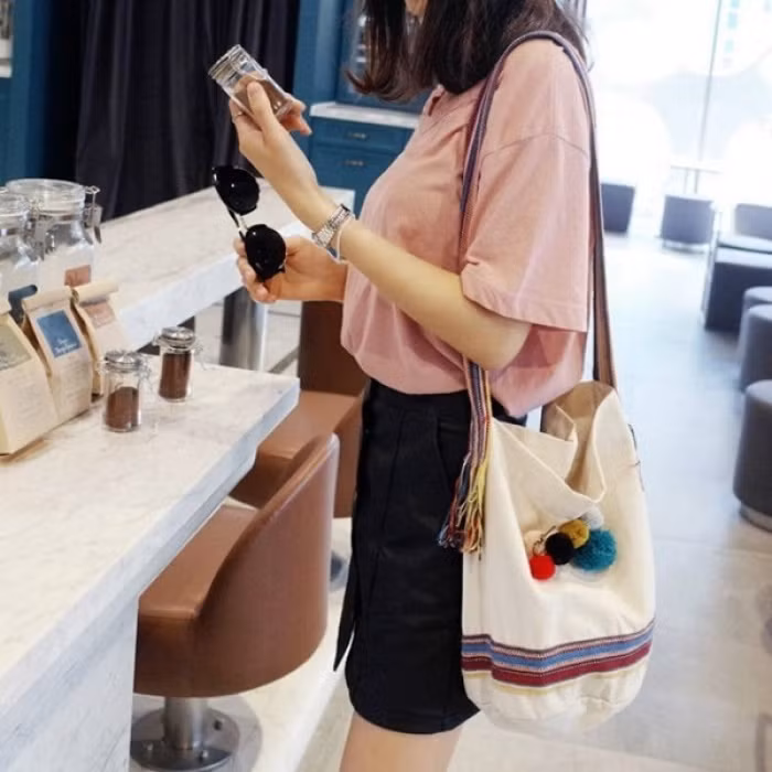 Với những tâm hồn trẻ trung, thích rong chơi, lại cũng thích nổi bật, thì những chiếc túi xách mềm mại đính quả bông vui mắt sẽ giúp bạn tận hưởng mùa hè một cách sôi động nhất. Túi đính quả bông không cần kiểu dáng cầu kỳ, chỉ là những chiếc túi vải, gắn quả bông số lượng thưa thớt thì càng xinh, phối nhiều màu rực rỡ.