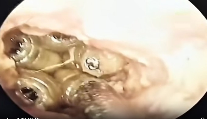 Hình ảnh những còn giòi sống ngọ nguậy trong tai bệnh nhân/Ảnh BV