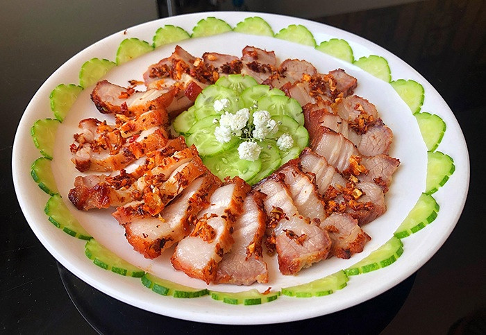 Thịt chín vàng đều cho ra đĩa, lấy giấy thấm dầu thấm đều xung quanh cho bớt mỡ. Sau đó thái miếng vừa ăn, xếp ra đĩa. Lấy sả, tỏi, ớt đã phi thơm ở trên rắc lên trên ăn cùng thịt chiên.