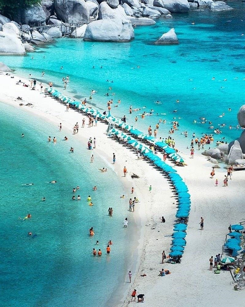 Đường xuyên biển ở Ko Nang Yuan (Thái Lan): Nằm phía tây bắc hòn đảo Ko Tao, Thái Lan, Ko Nang Yuan thu hút du khách bởi con đường cát trắng nổi lên trên mặt biển, nối liền 3 hòn đảo nhỏ gần nhau. Con đường này trở thành bãi tắm chính và khu vực sống ảo được ưa chuộng của du khách. Tuy nhiên, vào cuối ngày, khi thủy triều lên cao, đường cát sẽ bị nước biển che lấp. Ảnh: Morethanphuket, Kringyonthita.