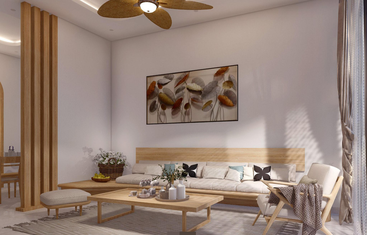 Phòng khách và gara ngăn cách chỉ bằng hệ lam gỗ, rất thông thoáng. Ngôi nhà hướng nhiều nắng nhưng cổng và hàng rào làm bước đệm cản nên trong nhà luôn mát mẻ.