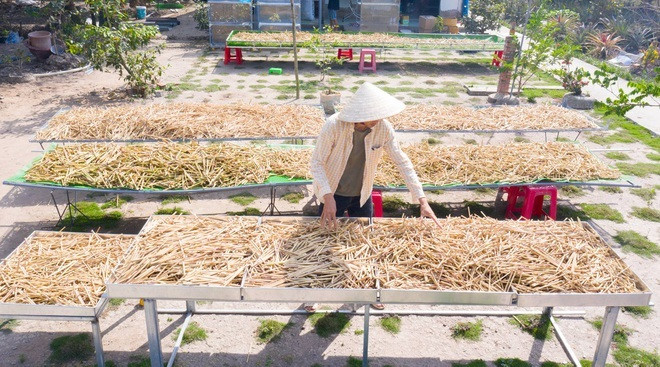 “Cỏ bàng khi thu hoạch cắt ra thành từng đoạn có độ dài từ 18-20 cm, đường kính ống từ 4,5-6,5mm, dày khoảng 0,5-0,8mm. Việc vệ sinh và thông các đốt cũng là công đoạn quan trọng, quyết định chất lượng của sản phẩm. Công việc này đòi hỏi sự khéo léo, tỉ mẩn của người làm”, anh No phân tích.