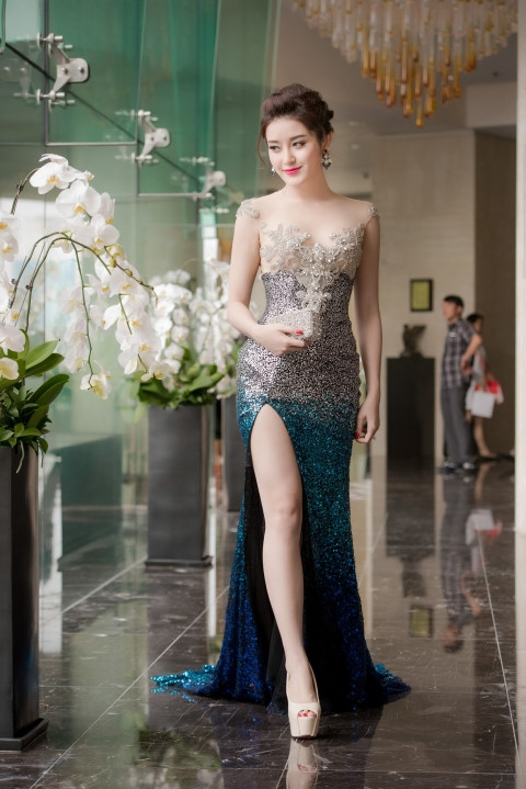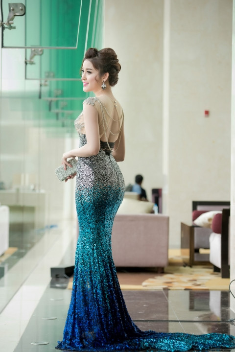 Chiếc đầm lấp lánh mà Huyền My mặc được làm bằng chất liệu sequin xuyên thấu cầu kỳ, đặc biệt là những chi tiết đính đá và kim loại quý trên ngực váy khiến cho tổng giá trị của bộ đầm lên tới 230 triệu đồng. Đây là một sản phẩm "vừa ra lò" của thương hiệu Joli Poli. Với thiết kế ấn tượng, bộ đầm giúp Huyền My khoe khéo vòng một đầy quyến rũ, tấm lưng trần nuột nà và đôi chân thon dài sexy. Những chi tiết sequin bắt sáng dọc thân váy cũng khiến Huyền My trở nên quyến rũ hơn, làm gợi nhớ tới hình tượng nàng tiên cá đầy bí ẩn.