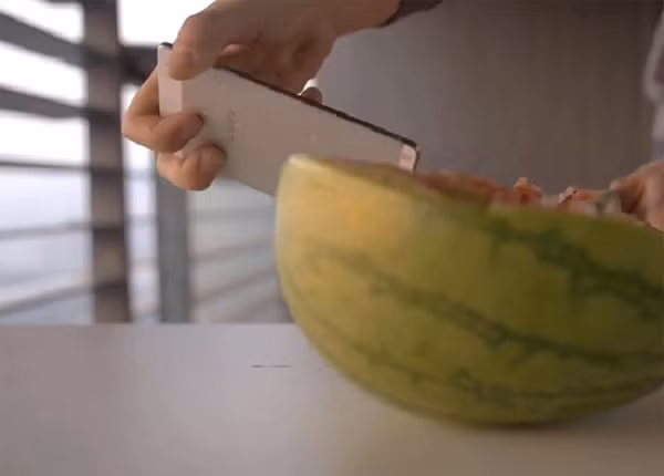 Các thử nghiệm độ bền đồng thời khoe độ mỏng được Oppo giới thiệu trong video. Trong đó, R5 siêu mỏng có thể dùng thay dao để cắt táo, dưa hấu, dùng thay búa đóng đinh lên mặt gỗ. Thậm chí, smartphone của Oppo còn có sự chịu đựng khi bị ôtô chèn qua.