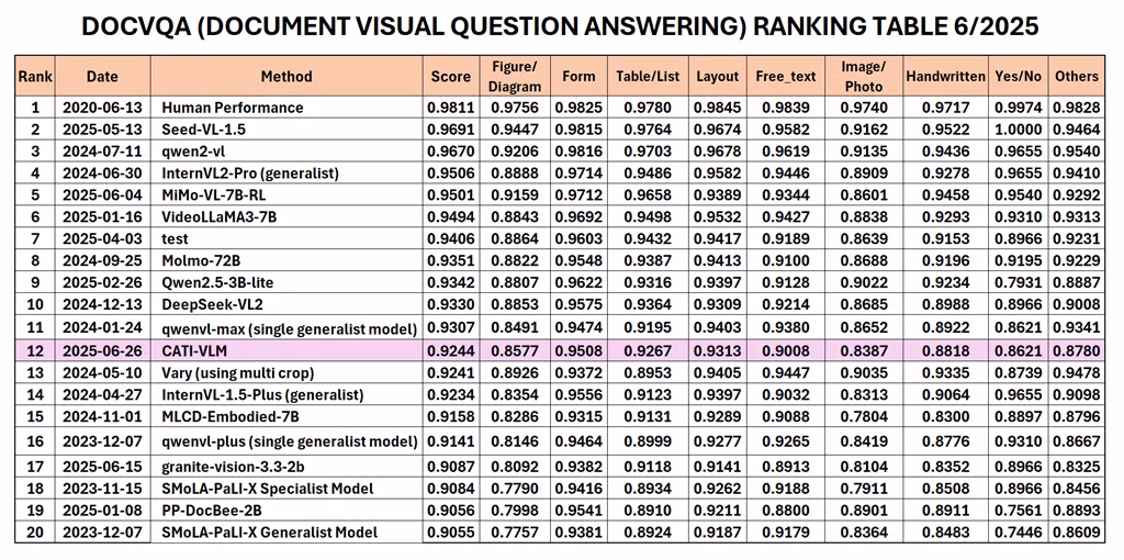 Mới đây, Viện Ứng dụng Công nghệ CMC (CMC ATI) đã công bố mô hình CATI-VLM (Visual Document Understanding) do đội ngũ nghiên cứu phát triển từ kho dữ liệu lớn 5TB, đạt Top12 thế giới và Top 1 Việt Nam trong bảng xếp hạng vừa được Robust Reading Competition (RRC) công bố tháng 6/2025 tại hạng mục Document Visual Question Answering (DocVQA).