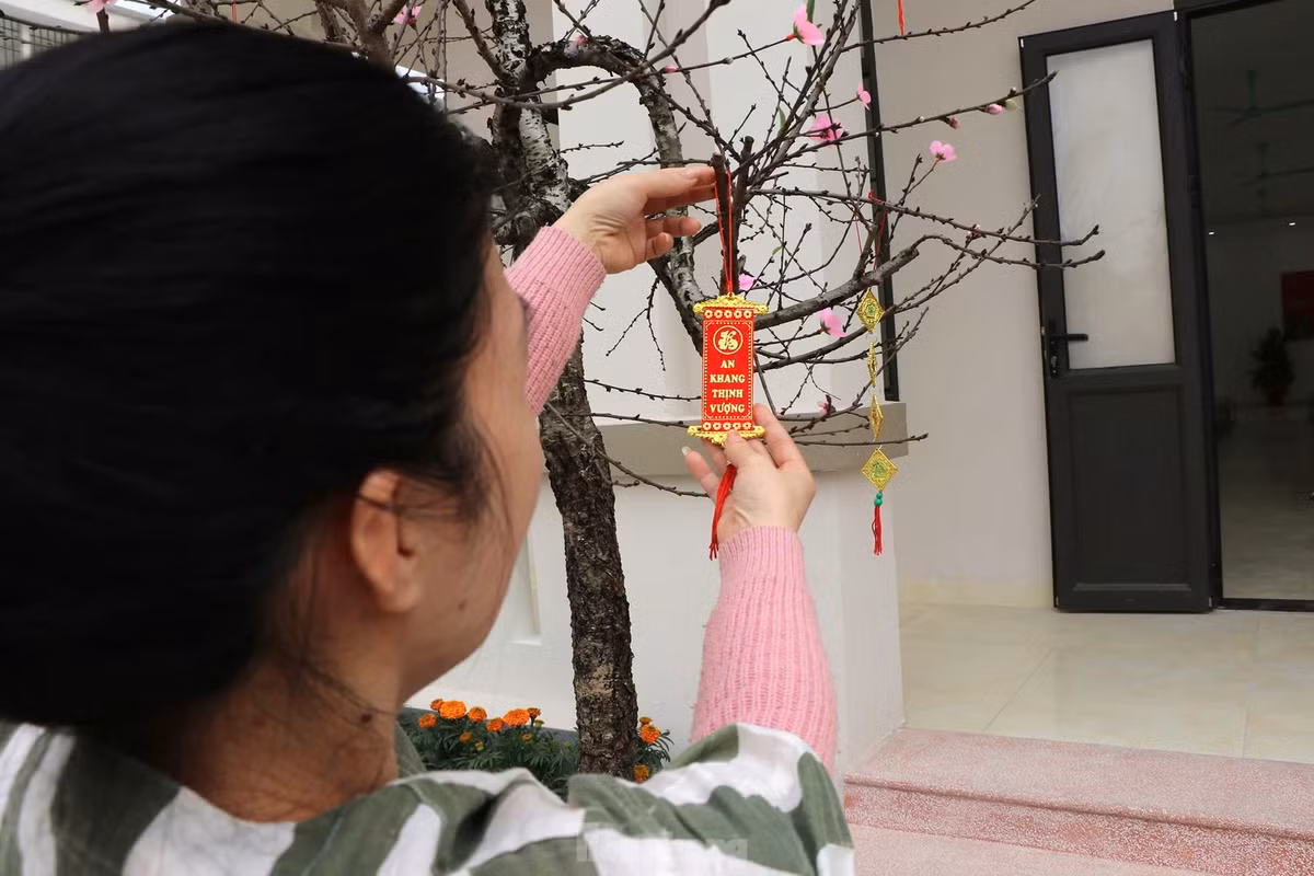 Các phạm nhân trang trí cành đào đón Tết.