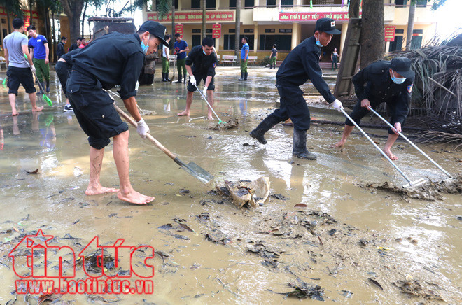 Tại trường Trung học cơ sở Nam Phương Tiến A, hàng tốp chiến sĩ công an không quản ngại khó khăn dọn dẹp sạch sẽ trường lớp cho các em nhỏ kịp đến trường cho năm học mới.