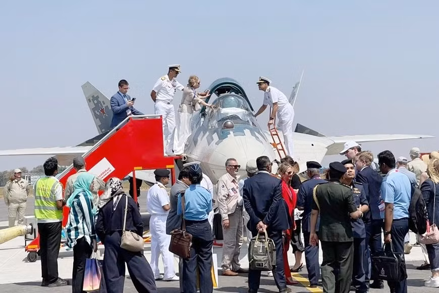 Các quan chức Ấn Độ tham quan Su-57 tại triển lãm Aero India 2025.