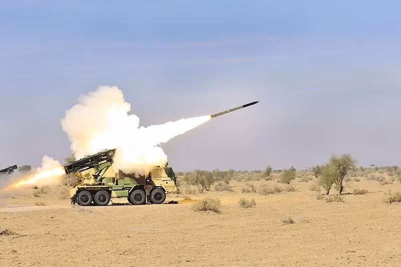 Pinaka là loại tên lửa đa nòng phóng loạt tự phát triển của Ấn Độ. Ảnh: Sputnik
