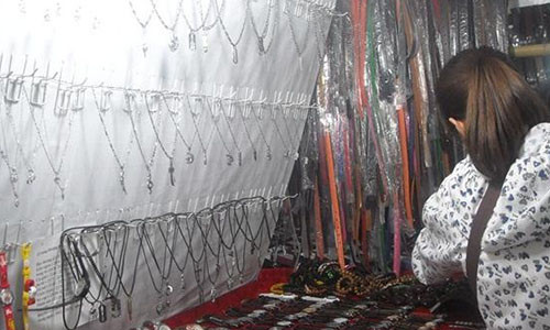 Chúng tôi dừng chân trước một quầy trang sức đông khách ở gần cổng chợ. Chị chủ quầy hàng trẻ măng, gương mặt bự phấn gần như bị “quây” giữa một rừng khách hàng, chủ yếu là các bạn học sinh, sinh viên. Người đeo thử, người hỏi giá, người trả tiền mua hàng khiến cho chị và cô bé nhân viên không phút nào ngơi tay.