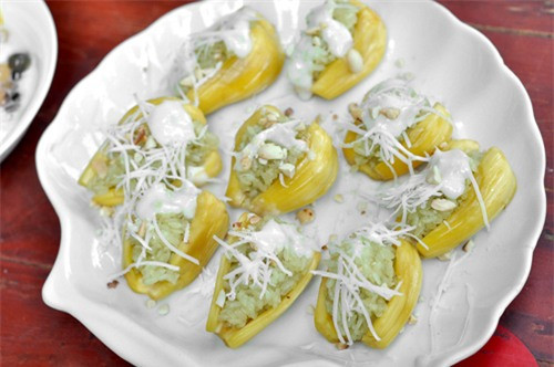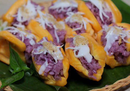 Múi mít sau khi xẻ thì dùng thìa múc một ít xôi cho vào giữa, tiếp theo bên trên rắc một ít dừa bào sợi, thêm muối vừng và rưới một ít nước cốt dừa.