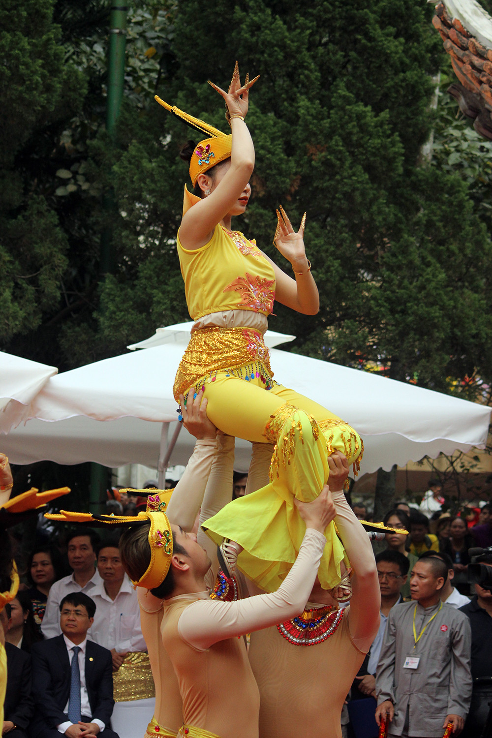 Du khách thích thú với các màn múa hát, biểu diễn nghệ thuật nên cùng nhau lưu lại khoảnh khắc ấn tượng, tuyệt đẹp sau khi tham quan, lễ Phật, cầu may đầu năm mới.