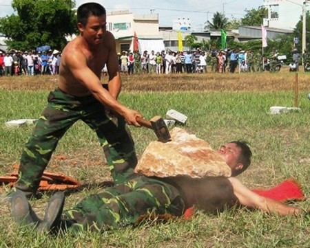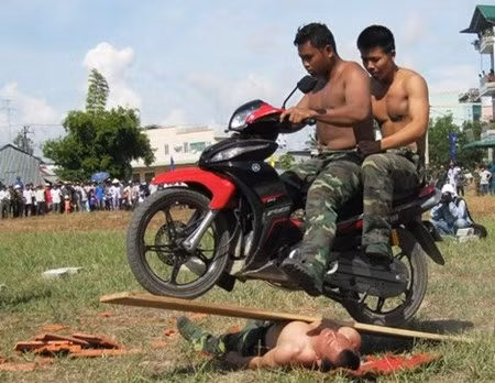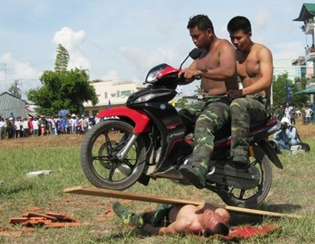 Các màn biểu diễn côn nhị khúc, trường côn, lao xe mô – tô qua người phía dưới lót miểng chai…