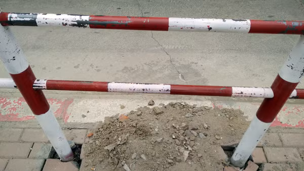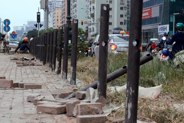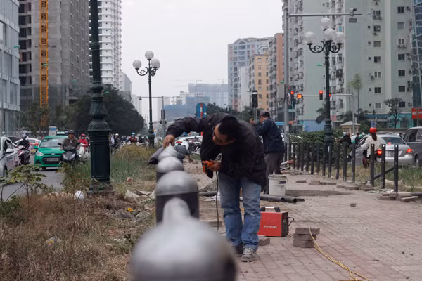 Hàng rào sắt chắn hai bên đang được công nhân hoàn thiện nốt.
