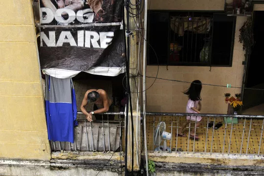 Hiện tại chung cư Cô Giang vẫn còn khoảng 300 hộ dân sinh sống. Trong ảnh: Người dân mang võng, chiếu ra hành lang ngủ để tránh cái nóng ban trưa.