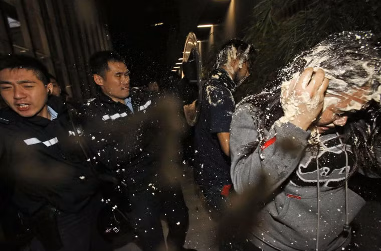 Một số người biểu tình quá khích bị cảnh sát dùng bình xịt hơi cay đẩy lùi.
