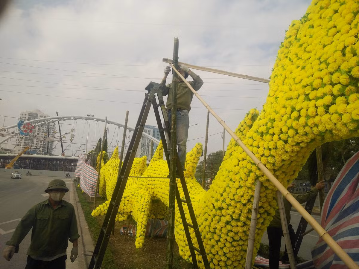 Công nhân tháo dỡ hoa giả trên mình rồng.
