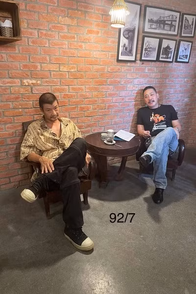 3 NSƯT Võ Hoài Nam, Hồ Phong và Mai Nguyên ở bối cảnh quay nhưng gây chú ý nhất là đôi giày thể thao hợp mốt của ông Sinh.