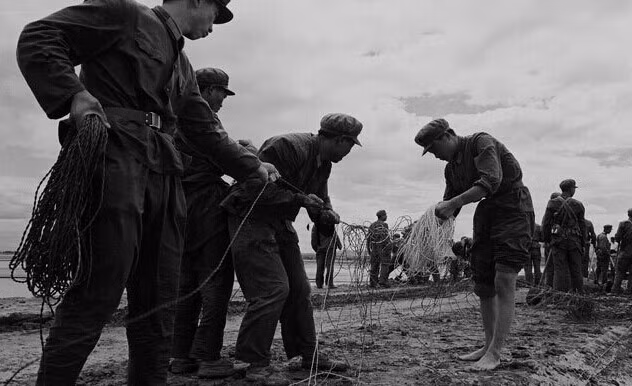 Đội hình xe tăng vượt sông trong khói lửa.