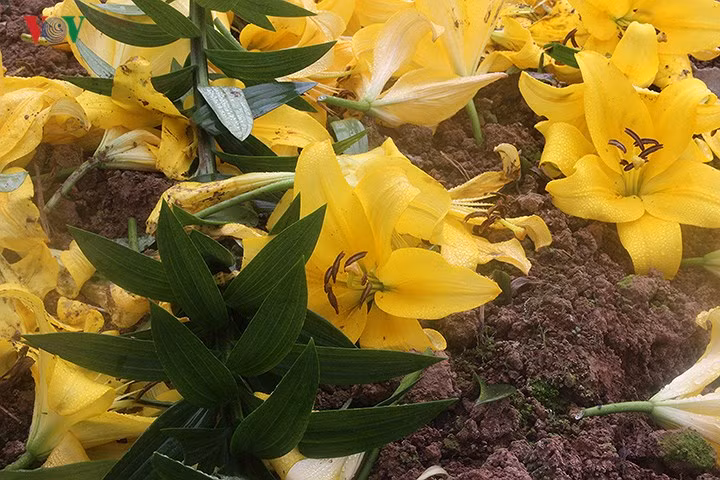 Những bông hoa ly vàng nở sớm bị cắt bỏ vàng rực thửa ruộng.