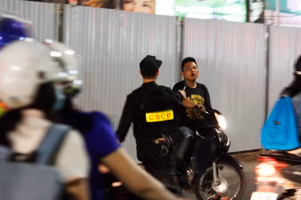 Đôi nam nữ không đội mũ bảo hiểm sẵn sàng đâm thẳng vào lực lượng của tổ công tác để chạy trốn.
