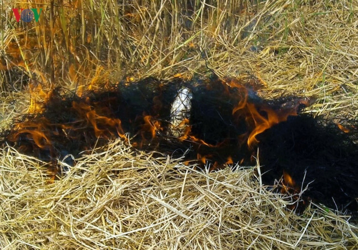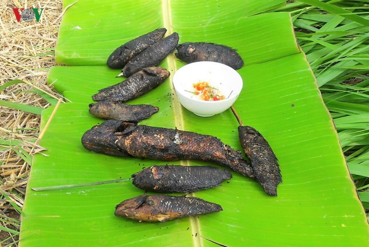 Trong thời gian chờ đợi bắt cá, các “thợ nghề” tranh thủ nướng những con cá đồng bắt được khi dọn cỏ và nhâm nhi cùng rượu đế.