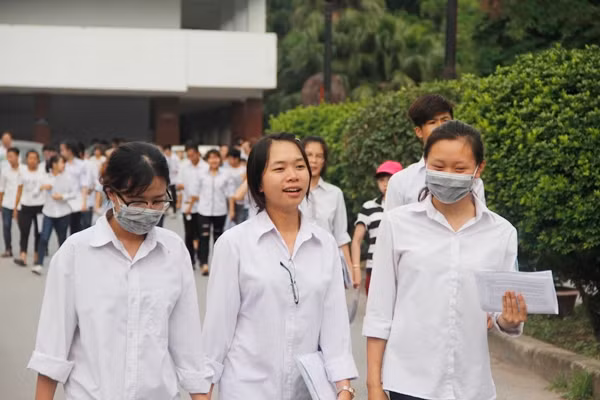 Nữ sinh vừa ra khỏi phòng thi vừa cùng nhau xem lại các câu hỏi trong đề xem được bao nhiêu điểm.