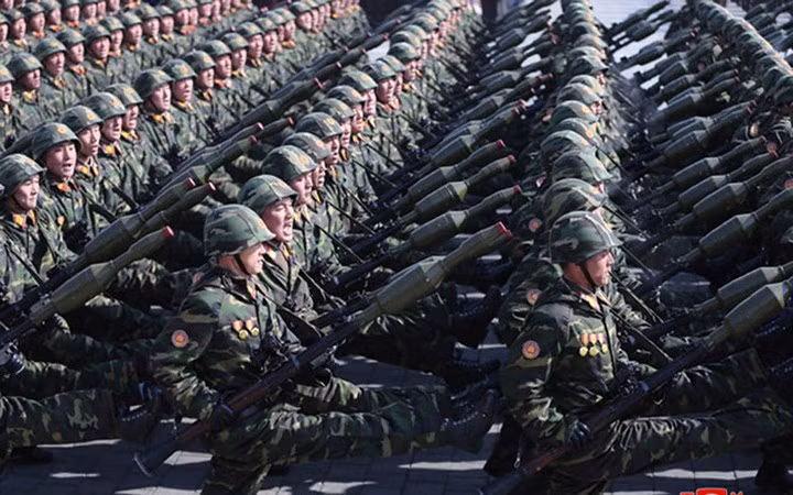Quân nhân Triều Tiên trong lễ diễu binh kỷ niệm 70 năm thành lập quân đội. (Ảnh: KCNA)