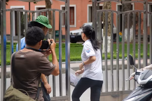 Rất nhiều nữ sinh đến muộn. Lực lượng bảo vệ vẫn tiến hành kiểm tra chặt chẽ, đầy đủ giấy tờ của các thí sinh mới cho vào khu vực trường thi.