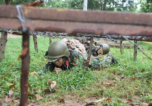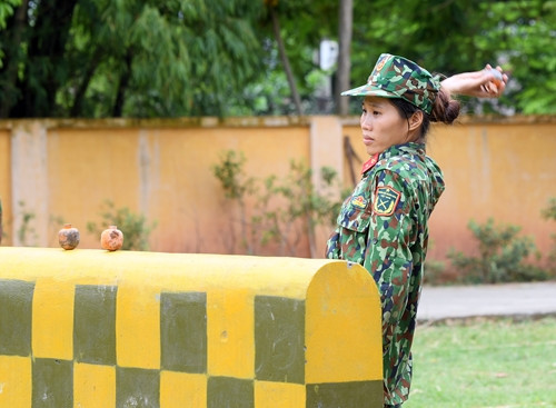 Ném lựu đạn, chạy vượt vật cản, bò qua hàng rào thép gai, tháo lắp súng … là những nội dung của bài thi vượt chướng ngại vật mà cả nam và nữ đều thi và tính giờ.