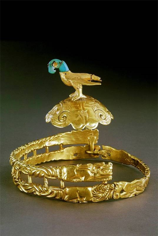 Các nhà khảo cổ đã khai quật được một chiếc vương miện hình chim ưng bằng vàng bên trong một ngôi mộ cổ ở ngoại ô thành phố Ordos, thuộc khu tự trị Nội Mông Cổ. Chiếc vương miện được chia thành 2 phần gồm một phần đai và một phần trang trí hình chim ưng đang sải cánh bay.