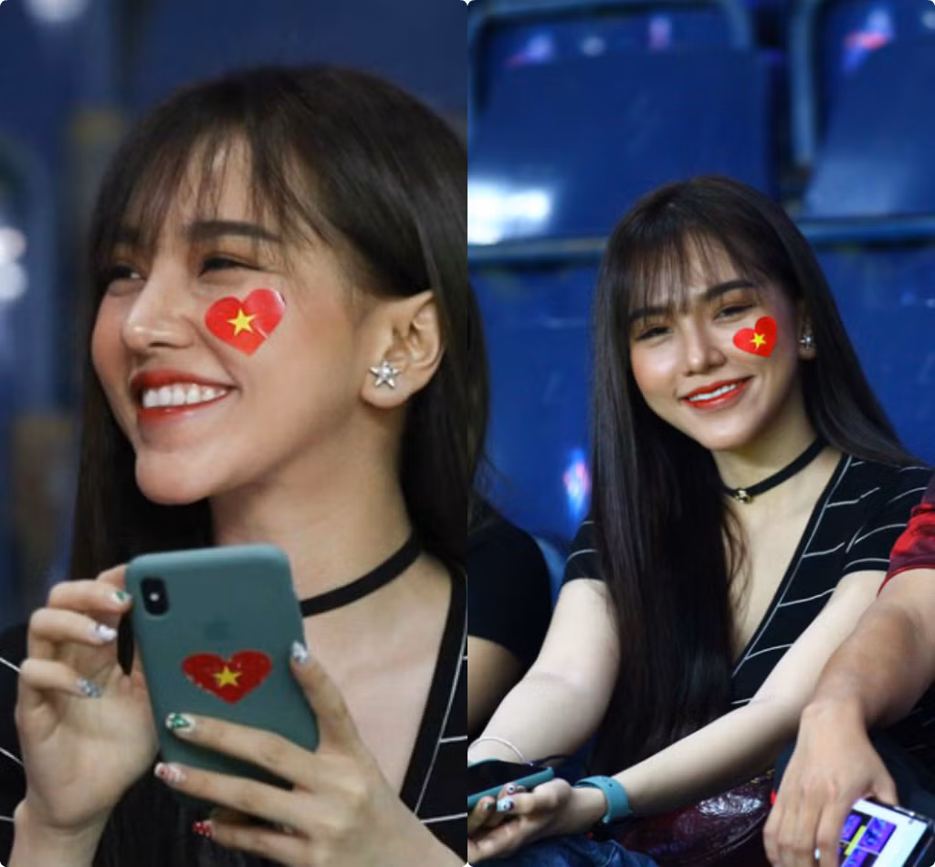 Sở hữu gương mặt xinh xắn, mũi cao cùng nước da trắng mịn, bạn gái Hoàng Đức thu hút mọi ánh nhìn. Gia Hân còn thể hiện tình yêu với bóng đá Việt Nam khi mặc áo cờ đỏ sao vàng nổi bật trên khán đài.