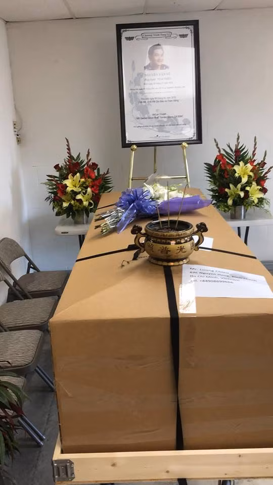 Linh cữu cố danh hài được bọc cẩn thận trước khi đưa về nước.